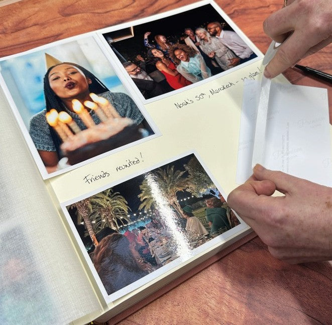 The pages of the album are completely plain and you fix the photos to the page using double sided tape, glue dots etc. It's all very easy and as the pages are plain, you have the complete freedom to stick in the photos in whatever configuration you like.